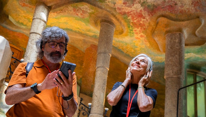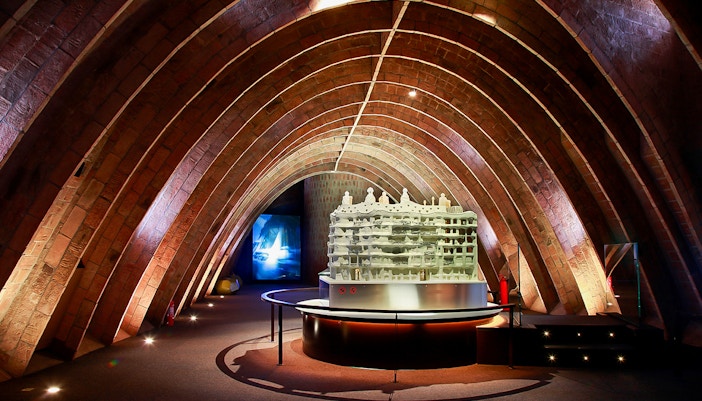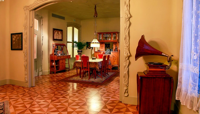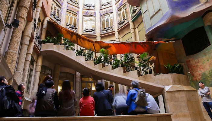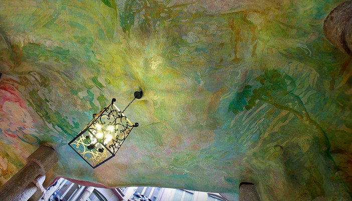 The hall is decorated with a series of mosaics depicting the four elements (earth, air, fire, and water), which were created by Gaudí's collaborator, Josep Maria Jujol. The entrance hall is located on the ground floor of the building and is accessed via a set of large, wooden doors.