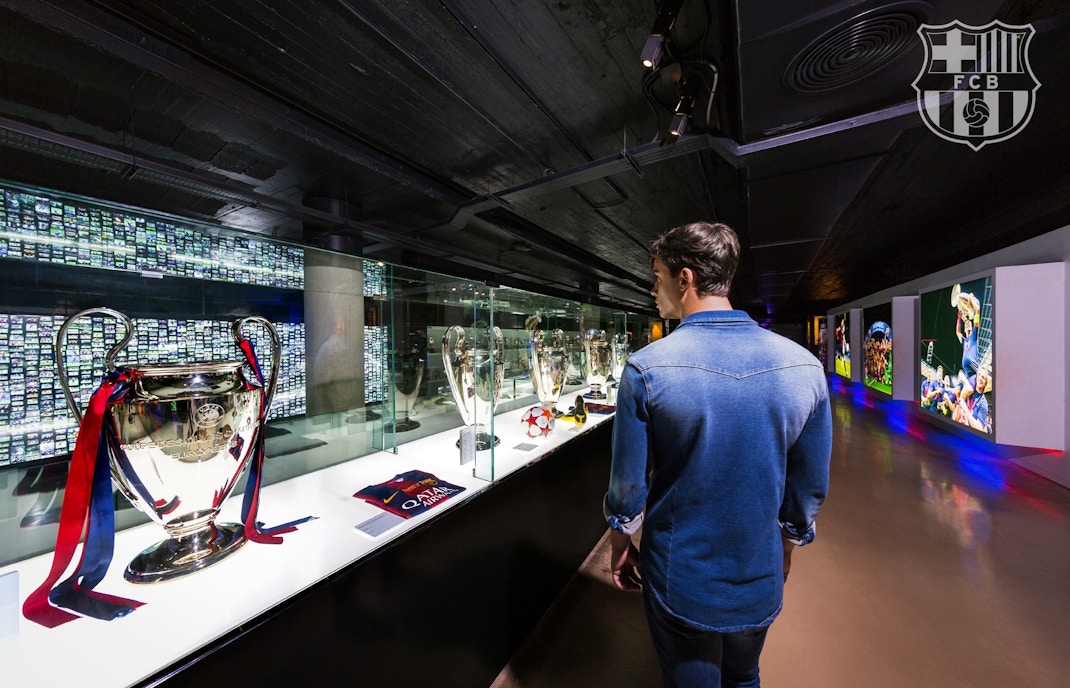 Zurück im Spotify Camp Nou, genießen Sie einen selbstgeführten Besuch des High-Tech-Museums mit interaktiven Exponaten und einem Panoramablick vom Aussichtspunkt des Stadions.