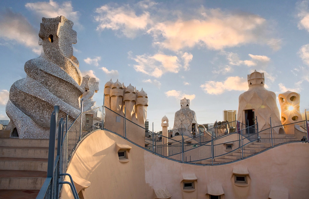 Die Dachterrasse ist vielleicht der außergewöhnlichste Bereich der Casa Milà. Marmorskulpturen, Oberlichter, Schornsteine und runde Treppen tragen zu seiner Schönheit bei. Es wurde mit Glas, Keramikscherben und Marmor verziert, um dem Dach einen Hauch von Bohème zu verleihen, was bei Gebäuden in Barcelona eher unüblich ist.