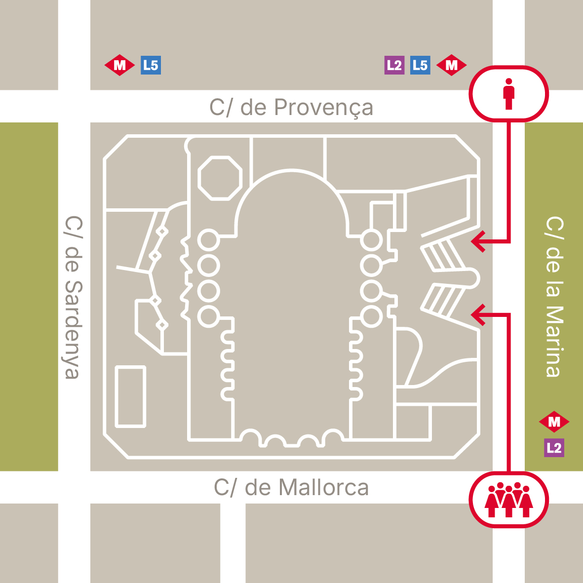 Wegbeschreibung: Sie erreichen die Krippenfassade über die Carrer de Mallorca und betreten sie durch das Tor auf der rechten Seite der Carrer de la Marina.