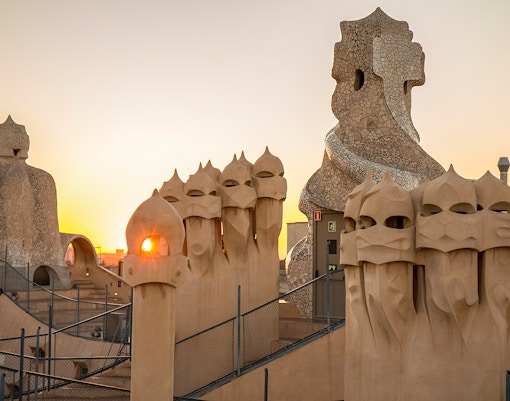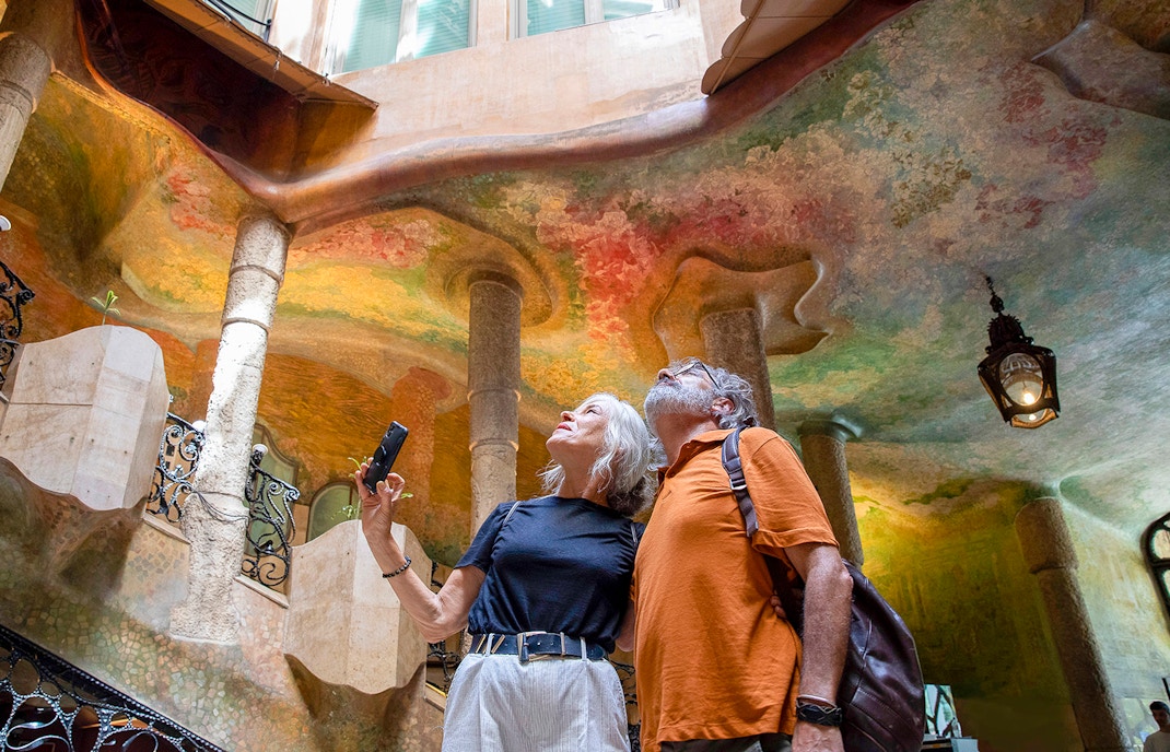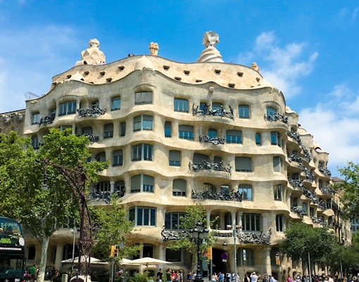 Ga aan de overkant van de Passeig de Gràcia staan en kijk hoe de steen beweegt. De kalksteen werd gewonnen met zeefossielen erin, dus het oppervlak bevat kleine schelpjes en koraalvormen. De smeedijzeren balkons, door Jujol's werkplaats uit schroot gedraaid, krullen als zeewier. Stap terug naar de Provençahoek om de hele golf in één foto te zetten.