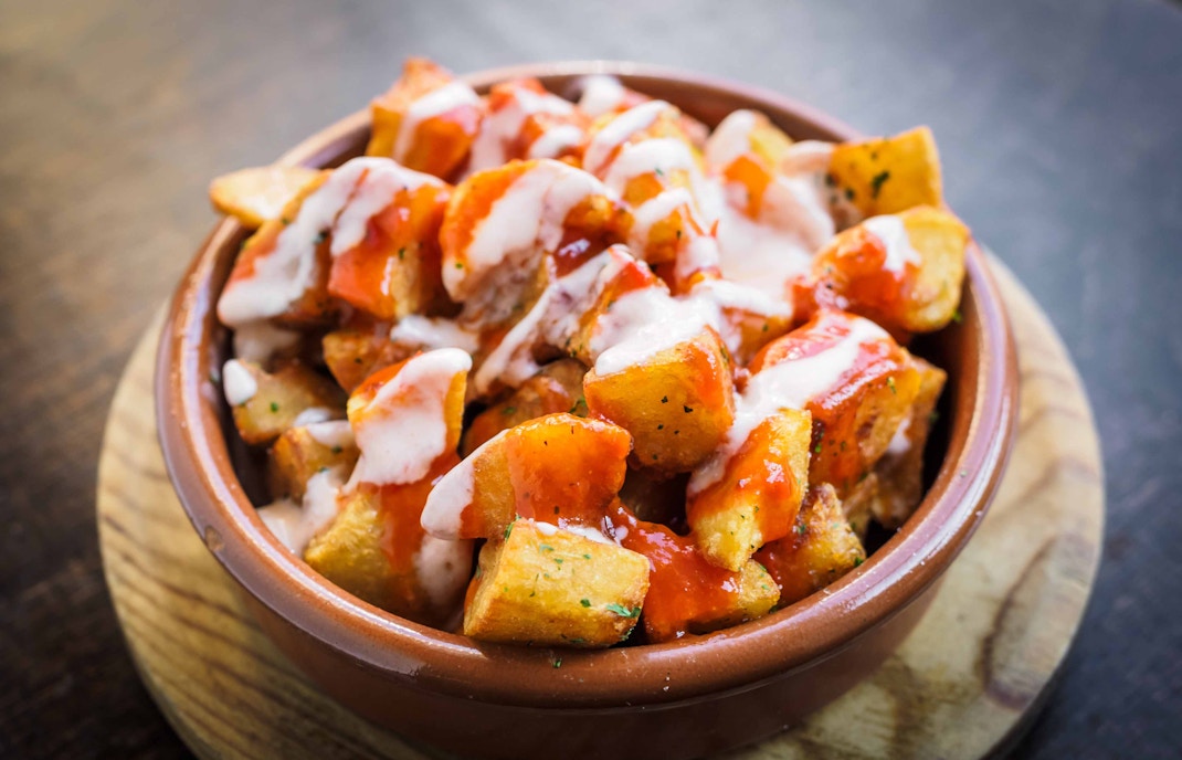 Essa comida tradicional de Barcelona é geralmente servida com dois molhos: salsa brava (picante, com cebola e páprica) e aioli (cremoso, com alho e limão). A mistura dos molhos com a batata crocante dá a você o efeito de "bomba" total.